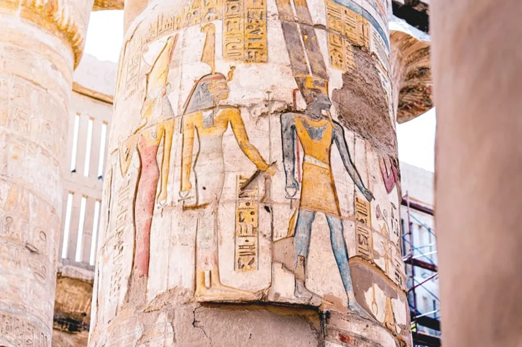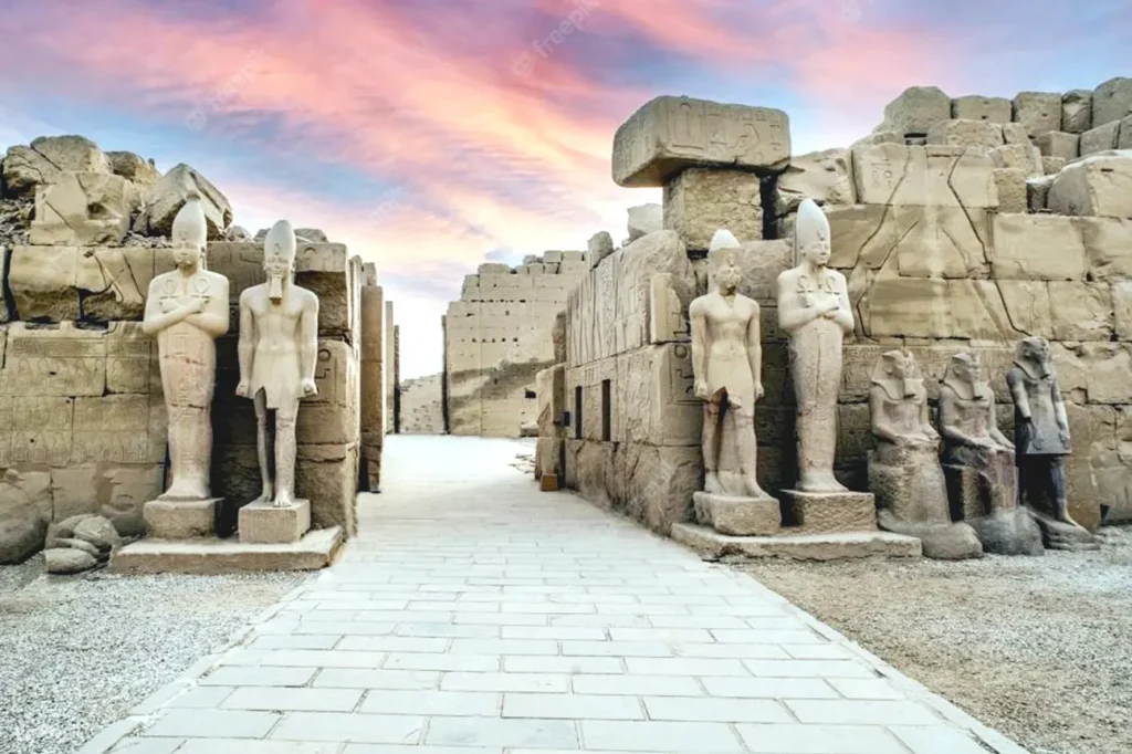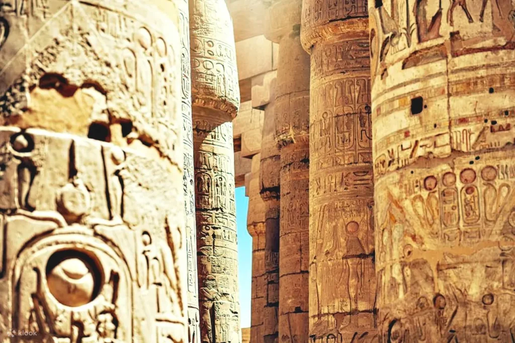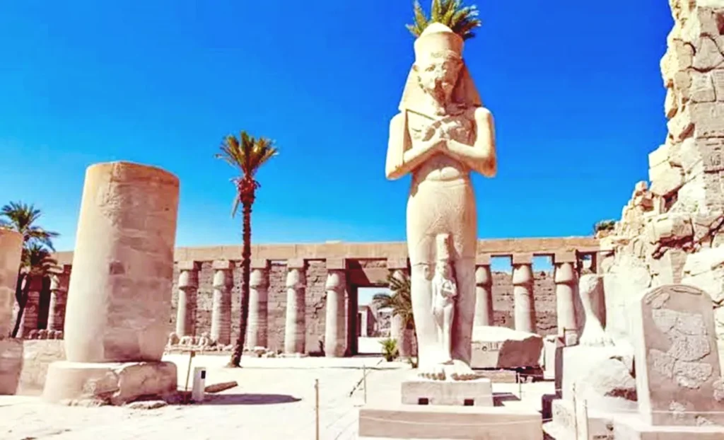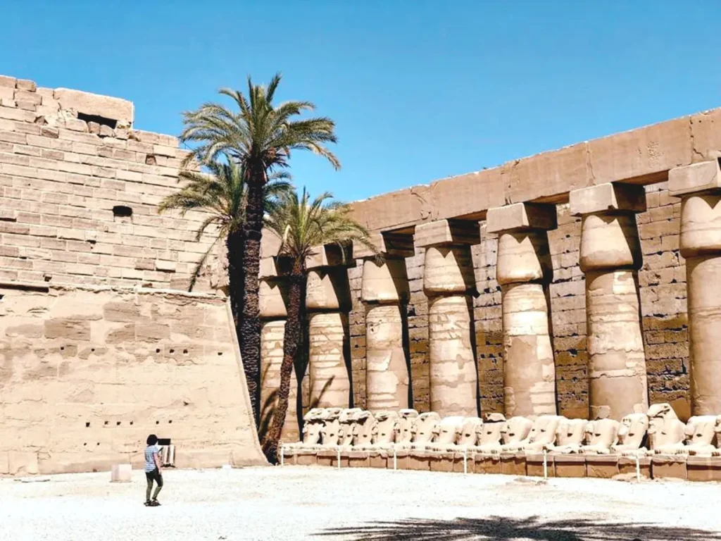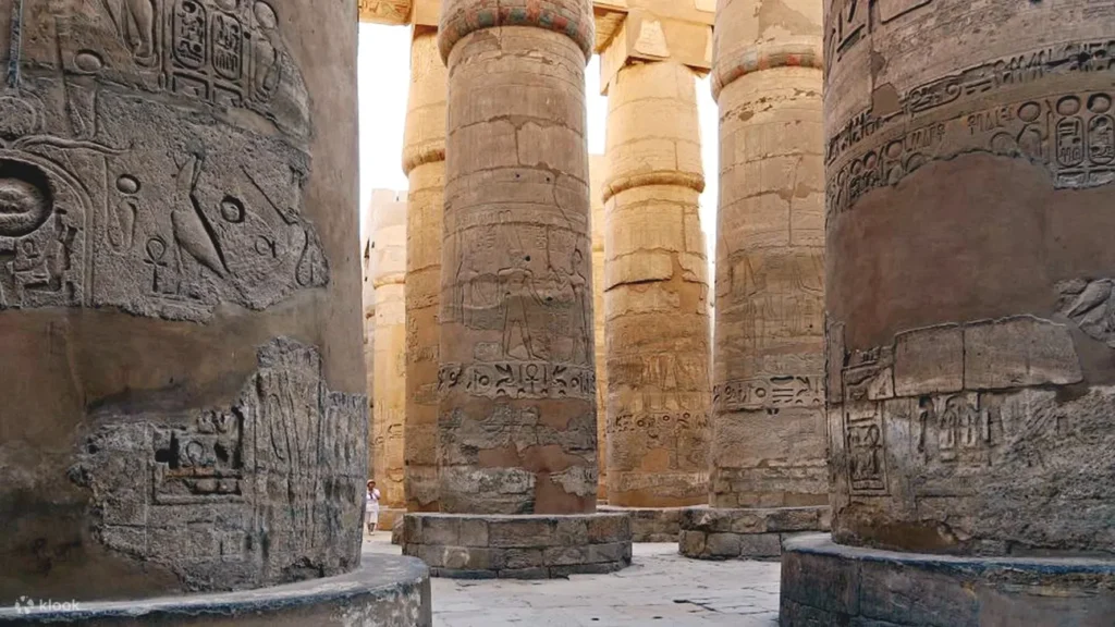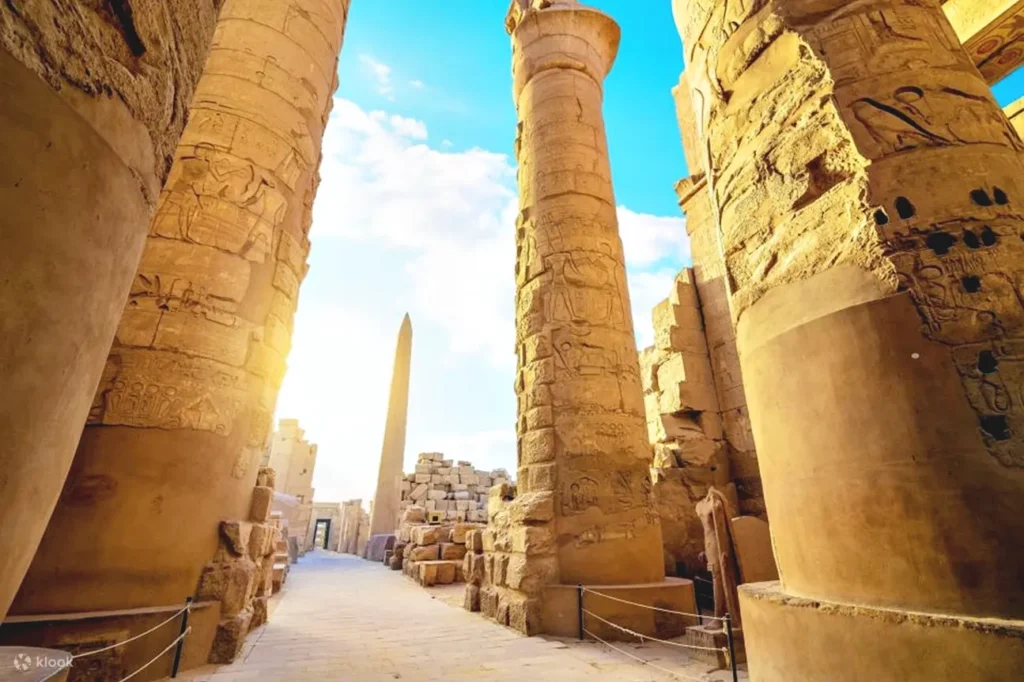 Explore the iconic Karnak Temple, one of the world’s largest temple complexes, featuring towering columns, obelisks, statues, sacred lakes, and chapels.